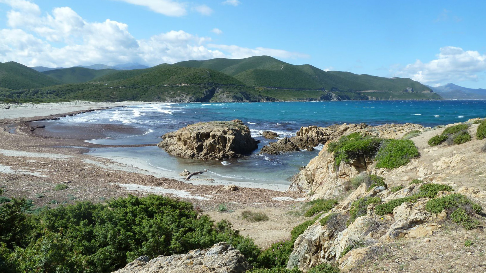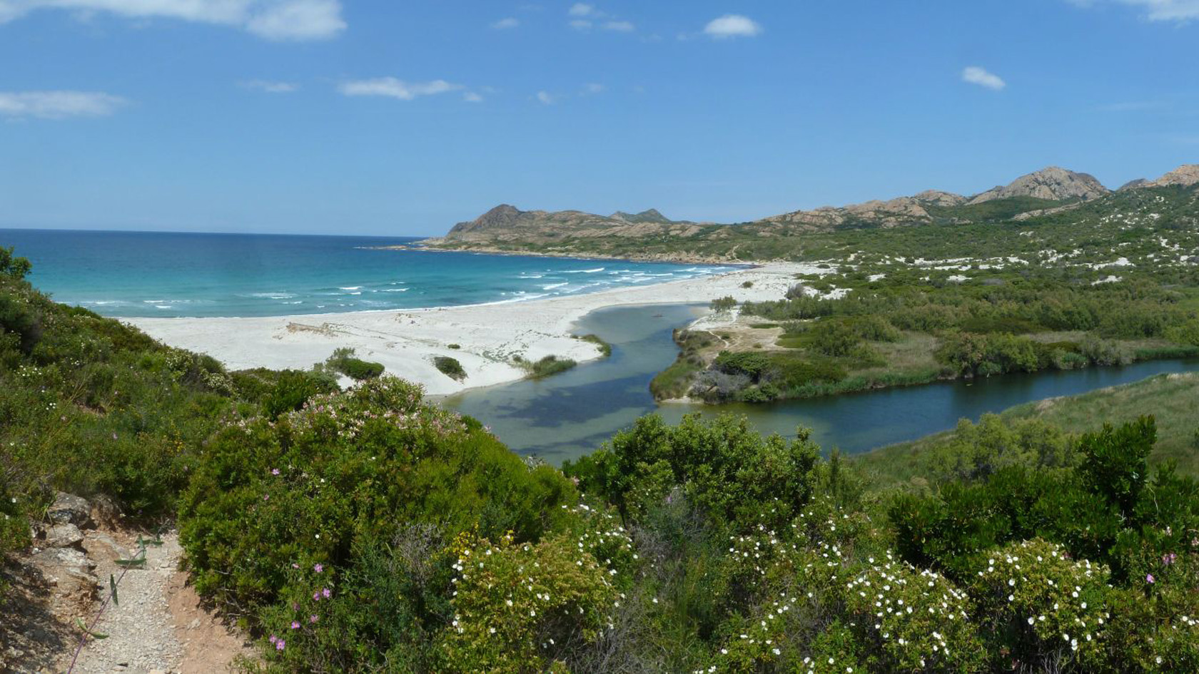 wilde und ursprüngliche Landschaft. Schmale Pfade führen durch gelb, rosa und weiß blühende Macchia, schroffe Kalkfelsen kontrastieren mit dem Grün der Steineichen. Das
